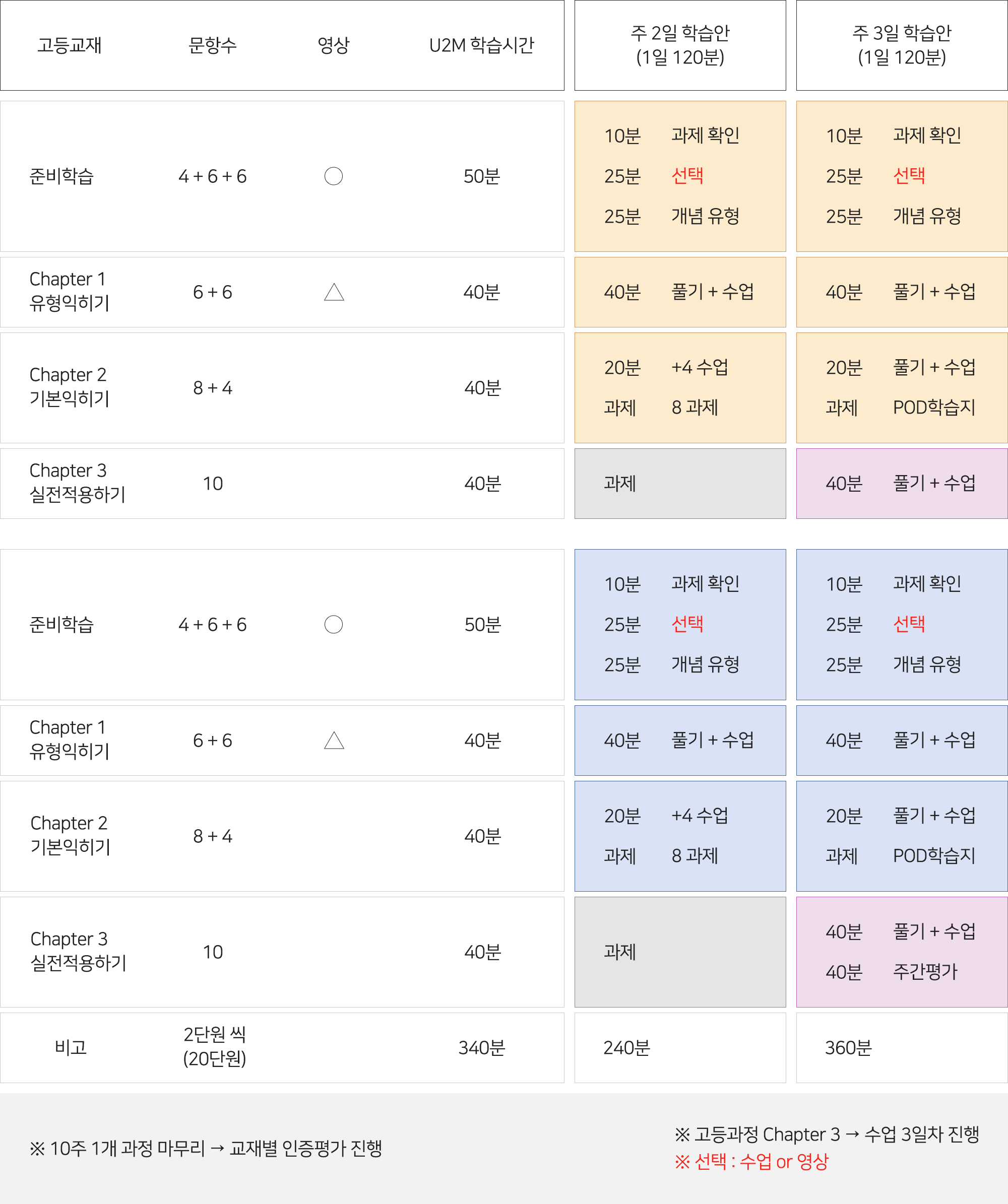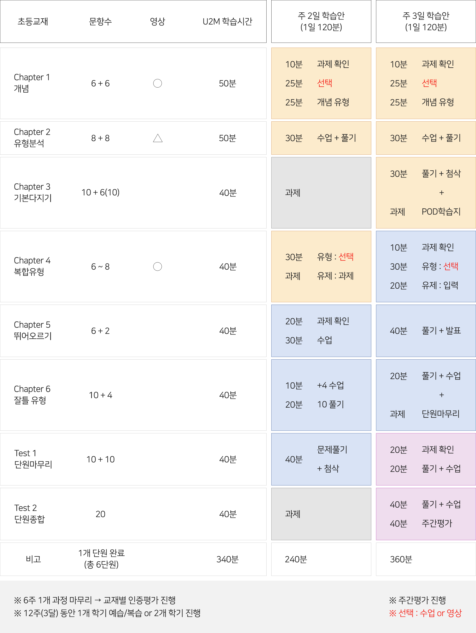 기본(하위) 교재 기준 주2일(1일 120분) 진행, 심화(상위) 교재는 주3일(1일 120분)을 권장