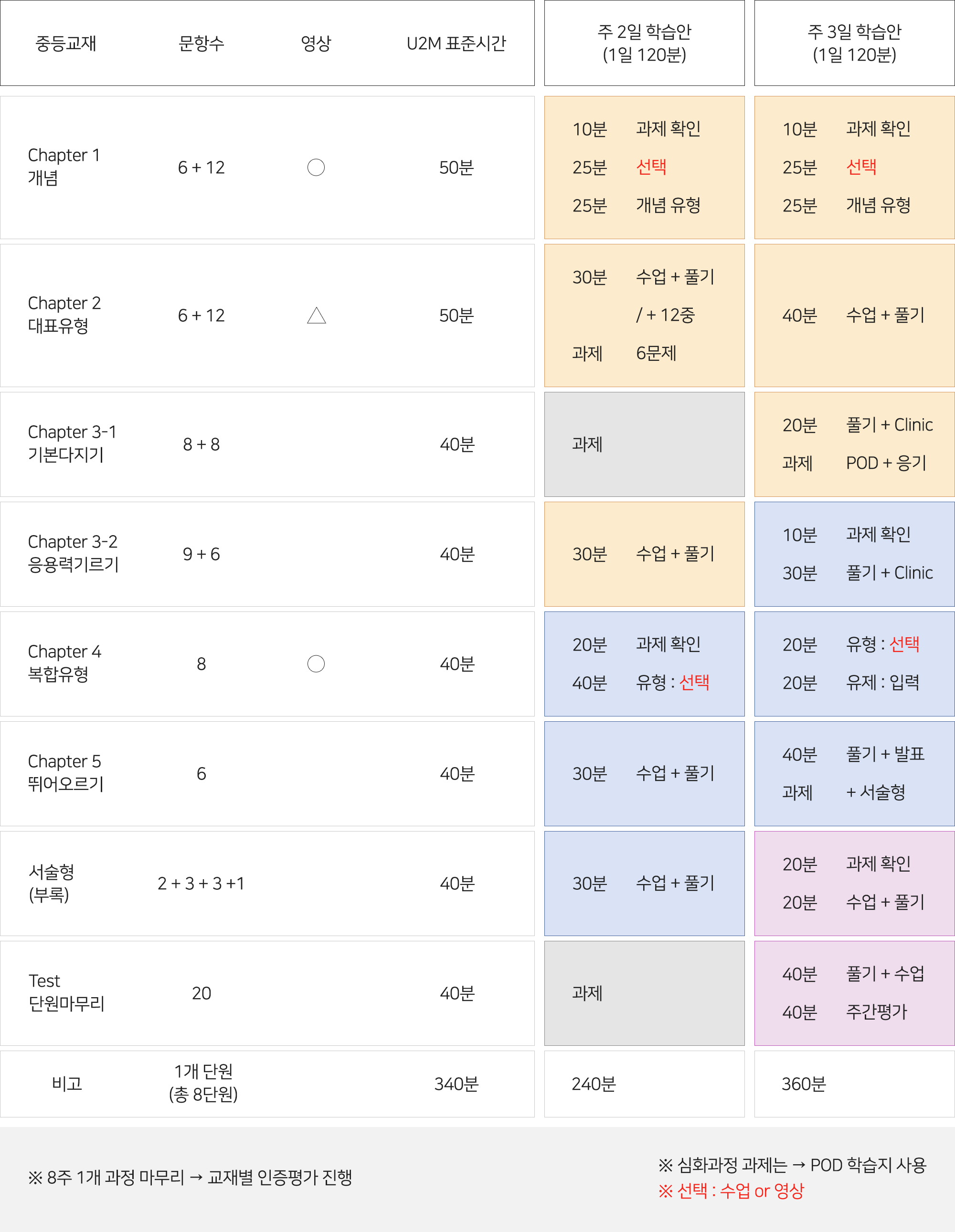 심화교재 : 초등의 심화/경시, 중등의 유노/포세이돈, 고등의 본 교재권장 학습시간 : 기본교재 1개 단원 240분, 심화교재 1개 단원 360분